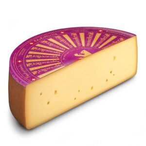 Swiss/Hard/Washed Cheese. This cheese boasts a 700-year history and is made with a unique secret recipe. During aging, it is washed in a brine solution containing a secret blend of cider, white wine, vanilla, and spices. The rind is light brown, with a strong, spicy aroma characteristic of washed cheese, and a rich, complex flavor profile. This cheese is aged for 9 months. Must be ordered by the case.