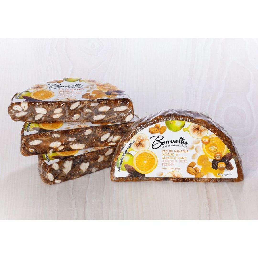 Bonvallis orange and almond cakes, from Madrid, Spain, are traditional Mediterranean dried fruit snacks. Handmade with locally sourced dried figs, dates, apricots, and other fruits, they have a naturally sweet flavor and are paired with nuts such as almonds and walnuts. Rich in fiber and minerals, they are high in fiber and gluten-free. Every bite offers the rich flavor of Mediterranean fruits and nuts! They also pair well with various flavored cheeses, foie gras, and meat sauces for an even better taste.