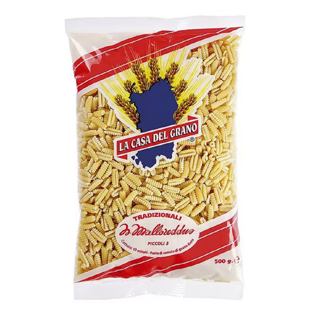 Sardinian gnocchi is made from 100% durum wheat flour and is one of the oldest types of pasta on the island of Sardinia. The original word, Is Malloreddus, is a Sardinian dialect word, but Gnocchetti Sardi or Sardinian Gnocchi are now more commonly known and used. Traditionally, Sardinian gnocchi is hand-pressed into its unique shape on woven willow or reed baskets; nowadays, it is mostly made using grooved wooden boards. La Casa del Grano uses a traditional copper mold to press the dough and then slowly dries it, creating a rough, uneven surface that not only allows the sauce to adhere better but also enhances the aroma and flavor. It is recommended to cook for 10 minutes and is best enjoyed simply with sausage and tomato sauce, pécrino cheese, or saffron.