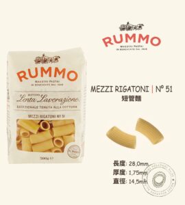 RUMMO N.51 Mezzi Rigatoni 500g*16/box Short, tubular pasta with a flat cut, wider than a penne, featuring prominent
