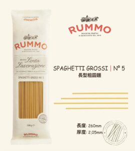 RUMMO N.5 Spaghetti Grossi 500g*24/box Thicker than spaghetti (round straight noodles), allowing it to absorb more sauce. It