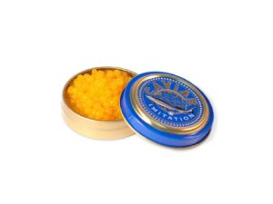 100% Chef Caviar Can "Imitation" 12 cans/pack Gold metal cans, approximately 80 grams each. Features a fish design.