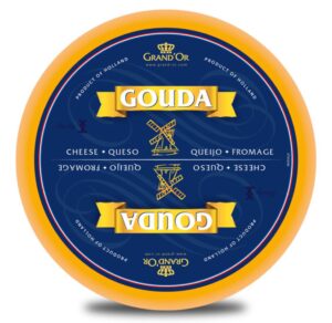 Originating in the town of Gouda in the southern Netherlands, Grand’Or quickly became popular throughout Europe, leading to the development of many flavored cheeses based on the Grand’Or base. Young Grand’Or cheese matures for 1 to 6 months, turning a pale yellow color with a rich, creamy aroma. It’s perfect with nuts, salads, or heated into sandwiches or used in cheesecake.