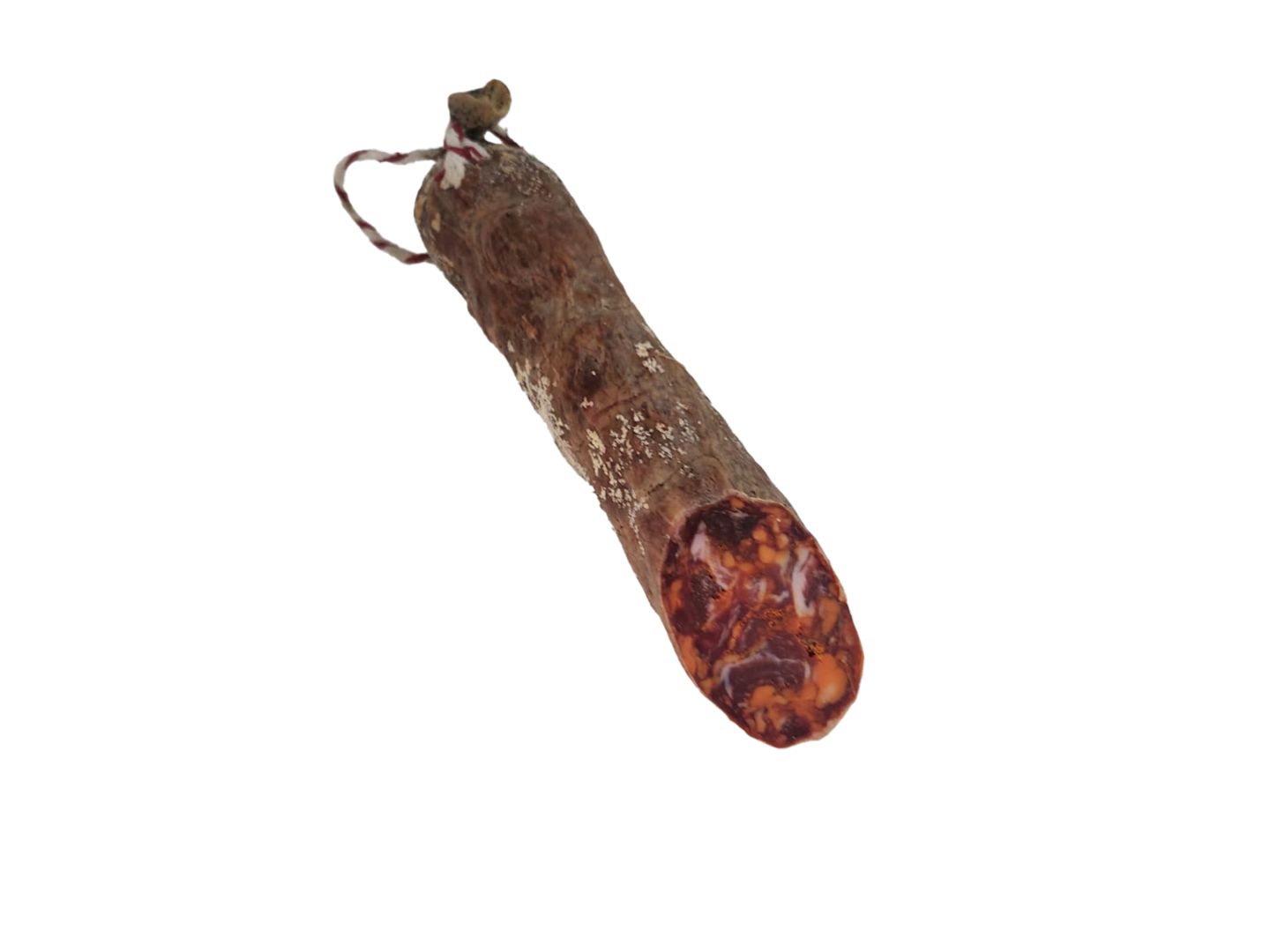 將豬肉絞碎添加鹽、大蒜、紅椒粉等調味料灌入腸衣,經長時間發酵、風乾和窖藏,口感扎實、有嚼勁,讓人越嚼越有滋味,蘊藏肥美豐盈的油脂,帶有紅椒的鮮紅色澤和特殊濃郁香氣。