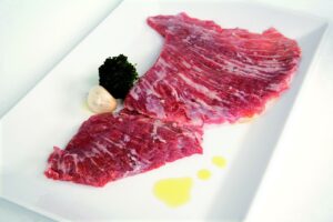 西班牙雪山牌100%橡子伊比利豬,肉質帶深紅色並富油質、充滿光澤,味道甜美帶核果香,並入口即化。