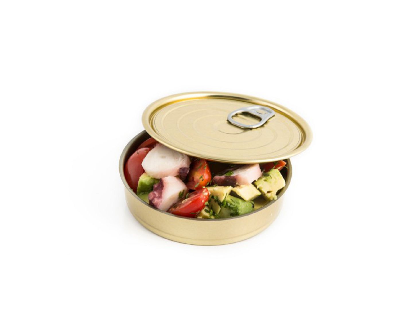帶易開蓋的馬口鐵罐,非常適合展示部分新鮮食品,就像罐裝產品一樣。尺寸:圓直徑11公分X高2.2公分(容量120ml)的馬口鐵(TIN)罐與蓋,內有保護膜,可盛放酸性食物,適合當作開胃菜、食物擺盤用具。